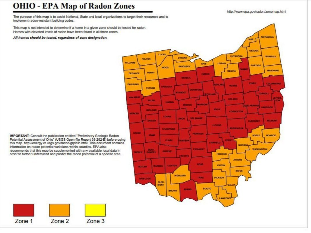In Ohio, Radon is a very Major problem. As this map, created by the EPA, shows, most of Ohio has very high levels of the gas (shown in red.) Franklin, Delaware & Montgomery Counties average DOUBLE the EPA max level of concern, and some of the highest measurements on record have been in the thousands in Ohio! Even those areas that aren’t totally high are still high enough to be of concern.